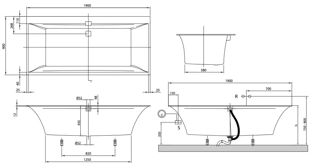 В комплекте поставляется подходящий слив-перелив и комплект ножек для ванны (самоклеящихся), регулируются от 130 до 180 мм.