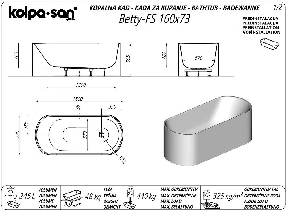 Ванна отдельностоящая Kolpa-San BETTY FS 160x73 595200 акриловая
