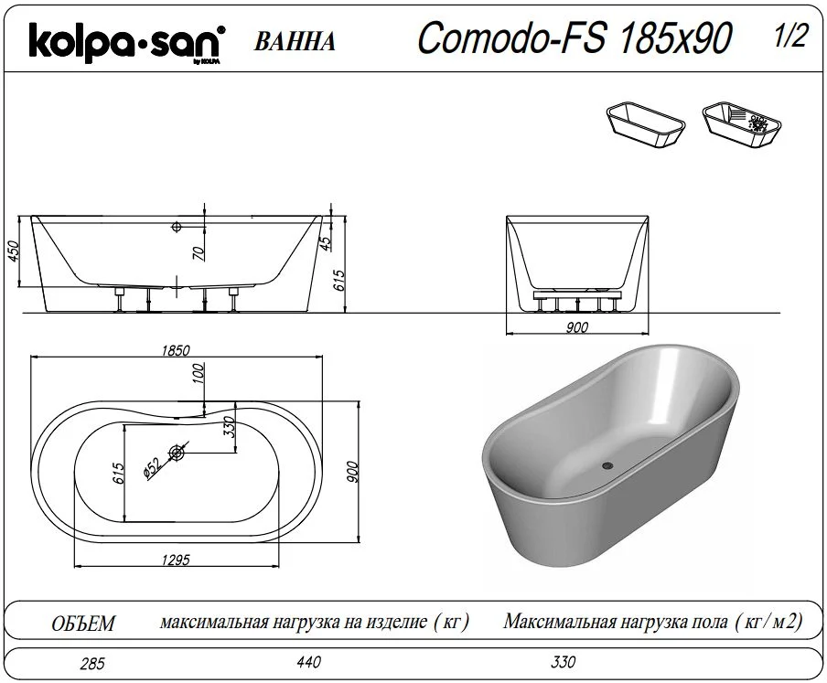 Ванна отдельностоящая Kolpa-San COMODO FS 185x90 593830 акриловая