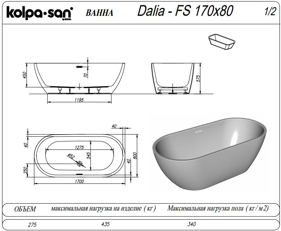 Ванна отдельностоящая Kolpa-San DALIA FS 170x80 561140 акриловая