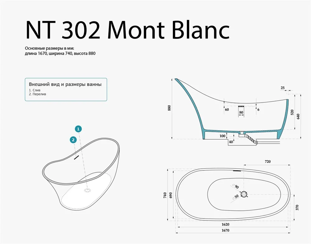 В этой модели удивительным образом сочетаются старинные очертания с современной, даже авангардной формой. В старину были очень модными ванны с одной высокой спинкой, как у кресла. В NT_302 MontBlanc успешно использован этот рисунок в самой современной интерпретации.