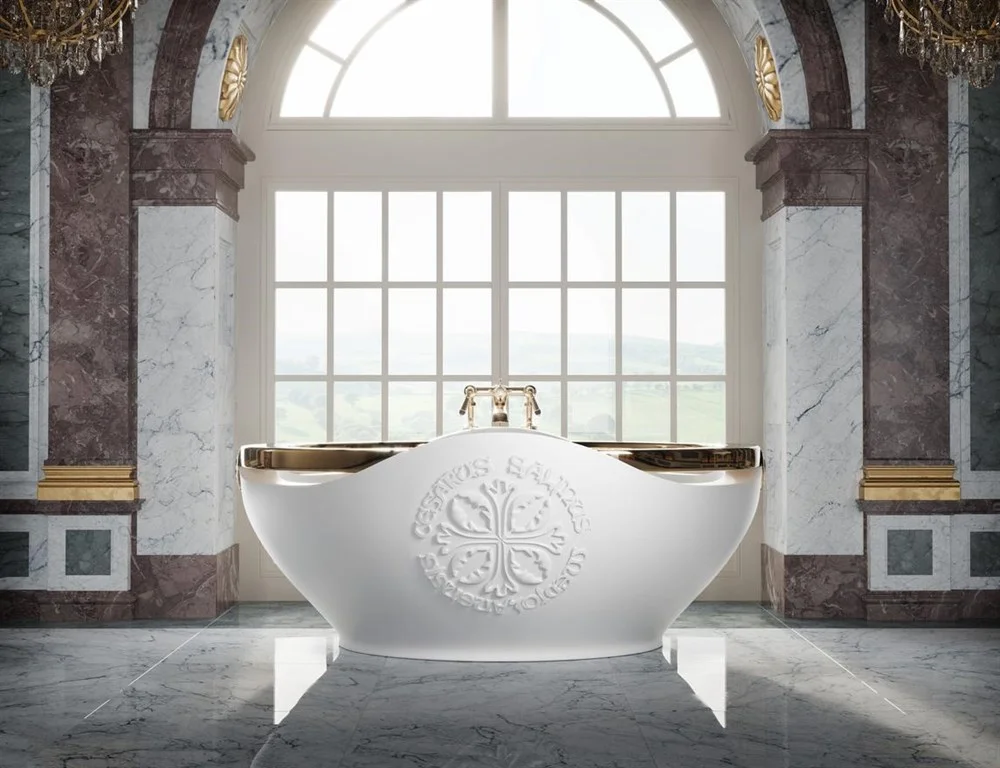 Отдельностоящая ванна из литого камня BIANKA от Salini. Яркая и вызывающая, эта ванна — дитя нескольких течений и стилей. Здесь встретились модерн, ар-деко и царственная свобода. Белоснежная, гладкая, как шелк, поверхность и богатая позолота с первого взгляда покоряют эстетикой роскоши. Внутренняя поверхность ванны вдохновлена гибкостью и подвижностью самой воды. Изысканное сочетание роскошной белоснежной напольной ванны и золота. Мягкая и текучая, вода не знает препятствий, преломляясь в лучах света, пробуждает всю гамму чувственных ощущений.