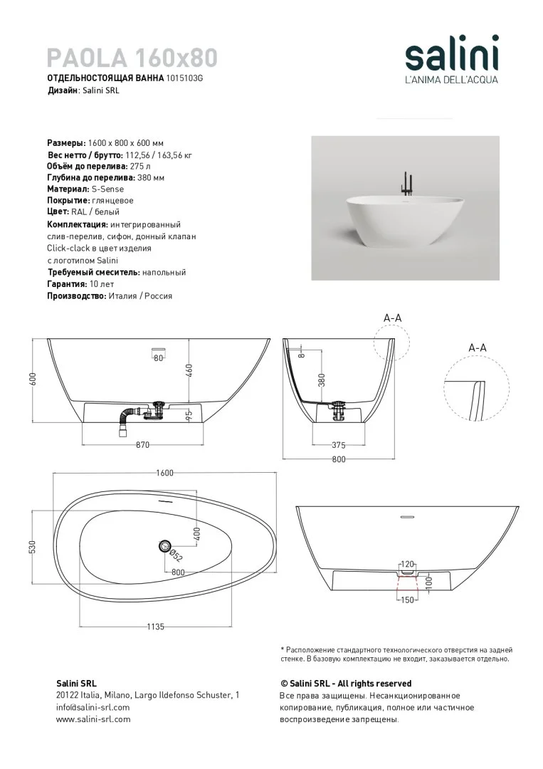 Обновлённая версия отдельностоящей ванны PAOLA не требует подиума или приямка для установки, обладает лаконичной формой без нижней «юбки», а также позволяет сделать технологический вырез для быстрого доступа к коммуникациям.