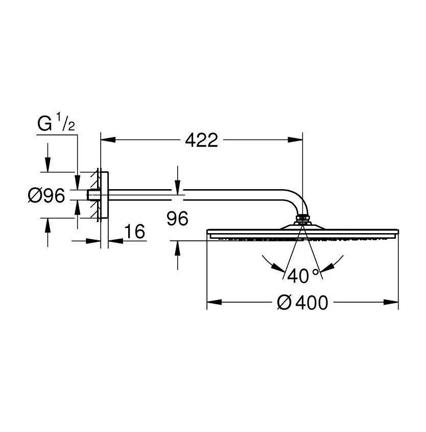 Rainshower® Cosmopolitan 400 Верхний душ и душевой кронштейн 422 мм включает в себя: верхний душ Rainshower® Cosmopolitan 400, металл (28778000) Душевой кронштейн Rainshower® 450 мм (26146000) GROHE DreamSpray® превосходный поток воды GROHE StarLight® хромированная поверхность с системой SpeedClean против известковых отложений DropStop отсутствие капель после выключения может использоваться с проточным водонагревателем