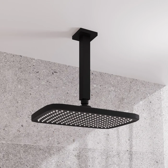 Черная матовая прямоугольная верхняя лейка для тропического душа Esper станет отличным дополнением для встраиваемой душевой системы или заменит надоевшую лейку душевого гарнитура. За счет большого размера лейка создает объемный поток воды, достаточный для комфортного принятия душа. Подходит ко всем кронштейнам со стандартным резьбовым соединением G 1/2”.