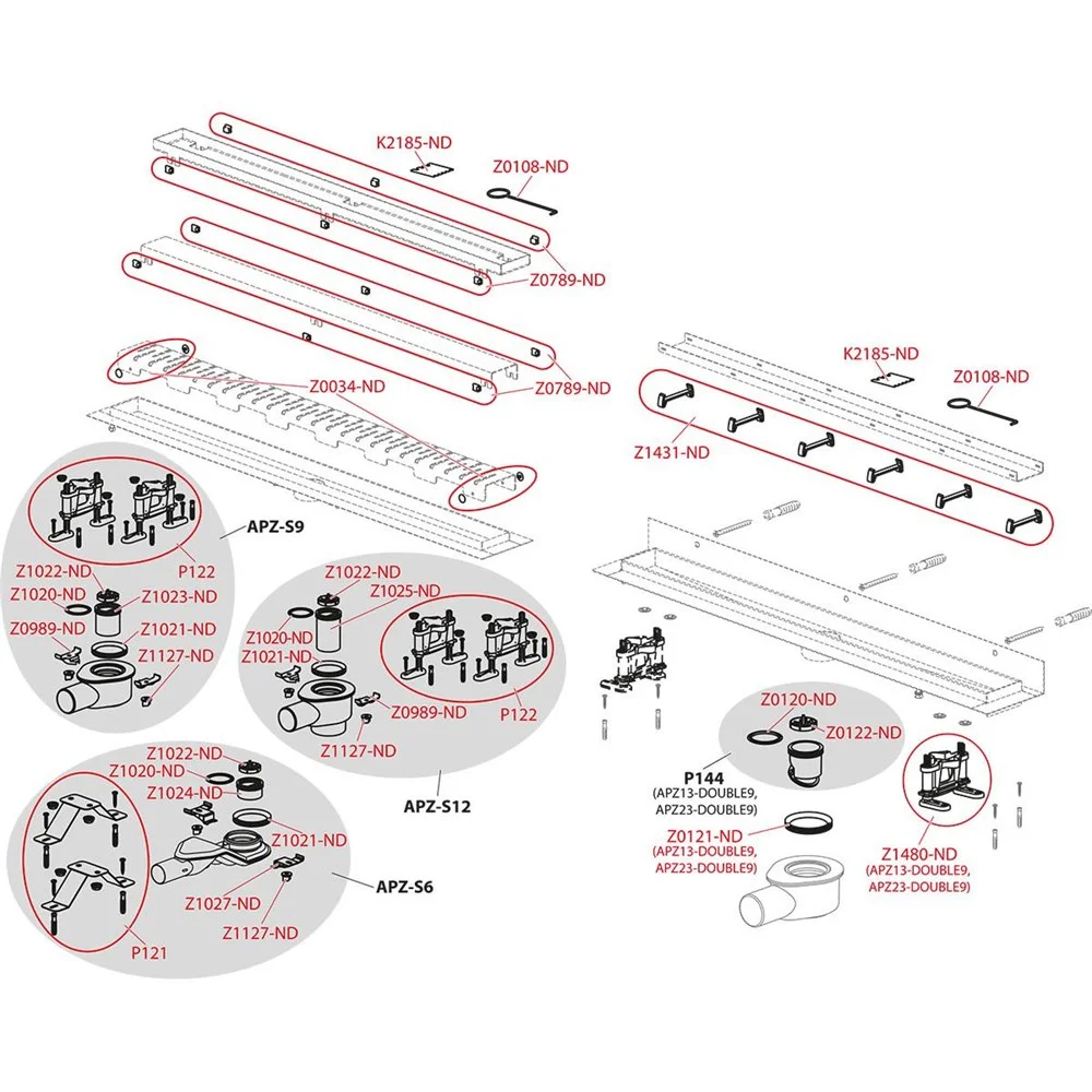 Водоотводящий желоб Двусторонняя решетка DOUBLE (полная решетка или решетка под кладку плитки) Сифон для водоотводящего желоба APZ-S9 Гидрозатвор – комбинированный SMART Регулируемые ножки 4 шт. Самоклеящиеся гидроизоляционные ленты Защитная пленка