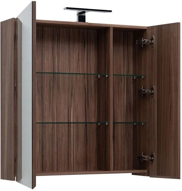 Зеркальный шкаф Aquanet Нью-Йорк 85 (орех) не нуждается в дополнительных декоративных деталях, живописной фурнитуре – шпон ореха, используемый в качестве покрытия, выполняет функции декорирования наилучшим образом. Зоны хранения в шкафчике шириной 85 см распределены по полочкам, скрытым за двумя фасадами, на которых закреплены зеркальные полотна, предназначенные для использования во влажных помещениях. Плавность открывания-закрывания дверок обеспечивает фурнитура немецкой компании Hettich. Корпус традиционно для мебели Aquanet выполнен из влагостойкой ЛДСП, фасады – из МДФ.