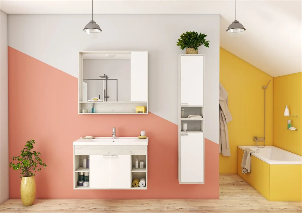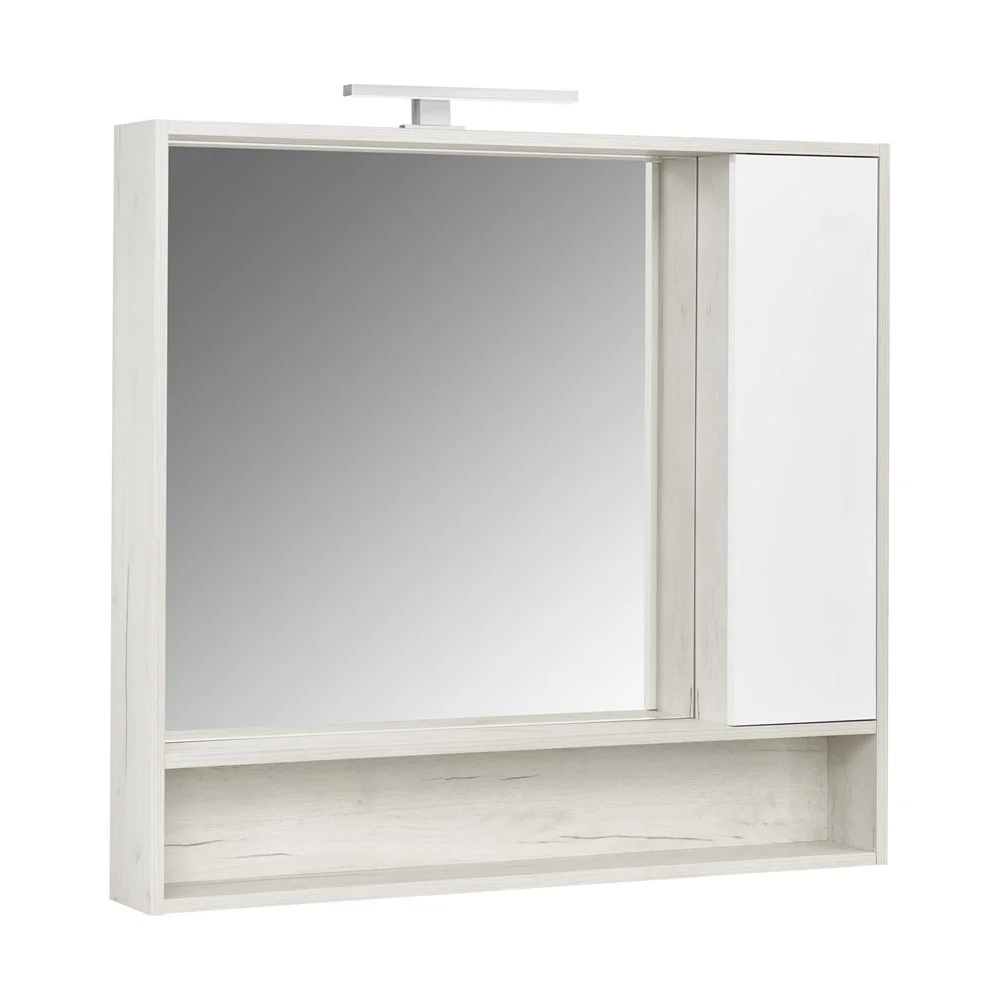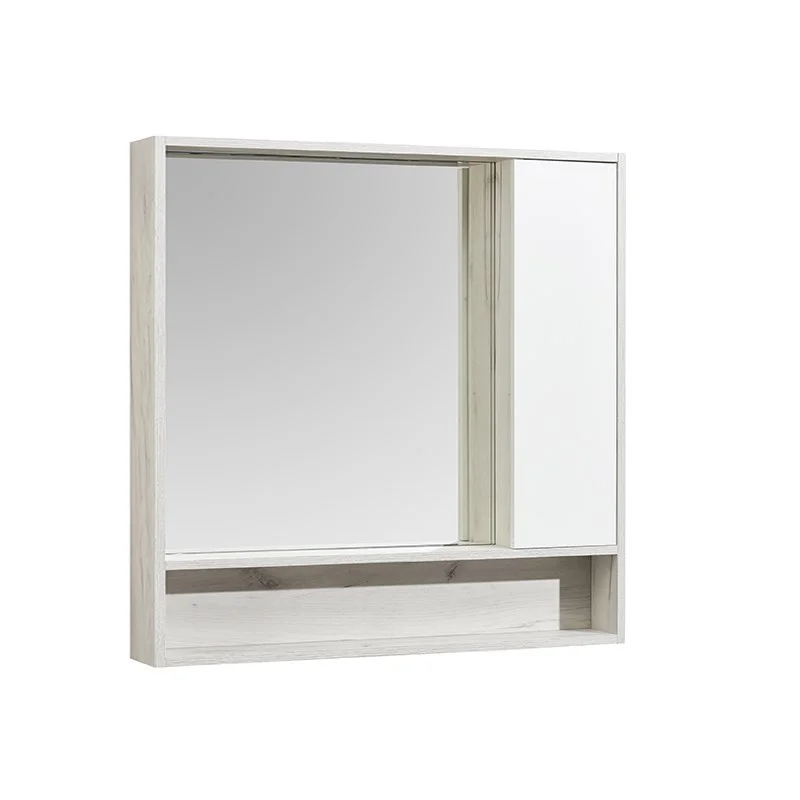 Корпус зеркального шкафа Флай 100 в современном стиле выполнен из влагостойкой ламинированной плиты в трендовом декоре дуб крафт. Фасад окрашен в белоснежный глянцевый цвет полиэфирной краской ультрафиолетового отверждения. Фасады тумбы окрашены полиэфирной краской ультрафиолетового отверждения. Такой способ окрашивания обеспечивает изделию привлекательный внешний вид, а также износостойкость и долговечность. Петли снабжены доводчиками для удобства использования. За фасадом находятся две полочки из влагостойкой ламинированной плиты. Удобная полочка под зеркалом прекрасно подойдет для размещения различных мелочей и декора для ванной комнаты.