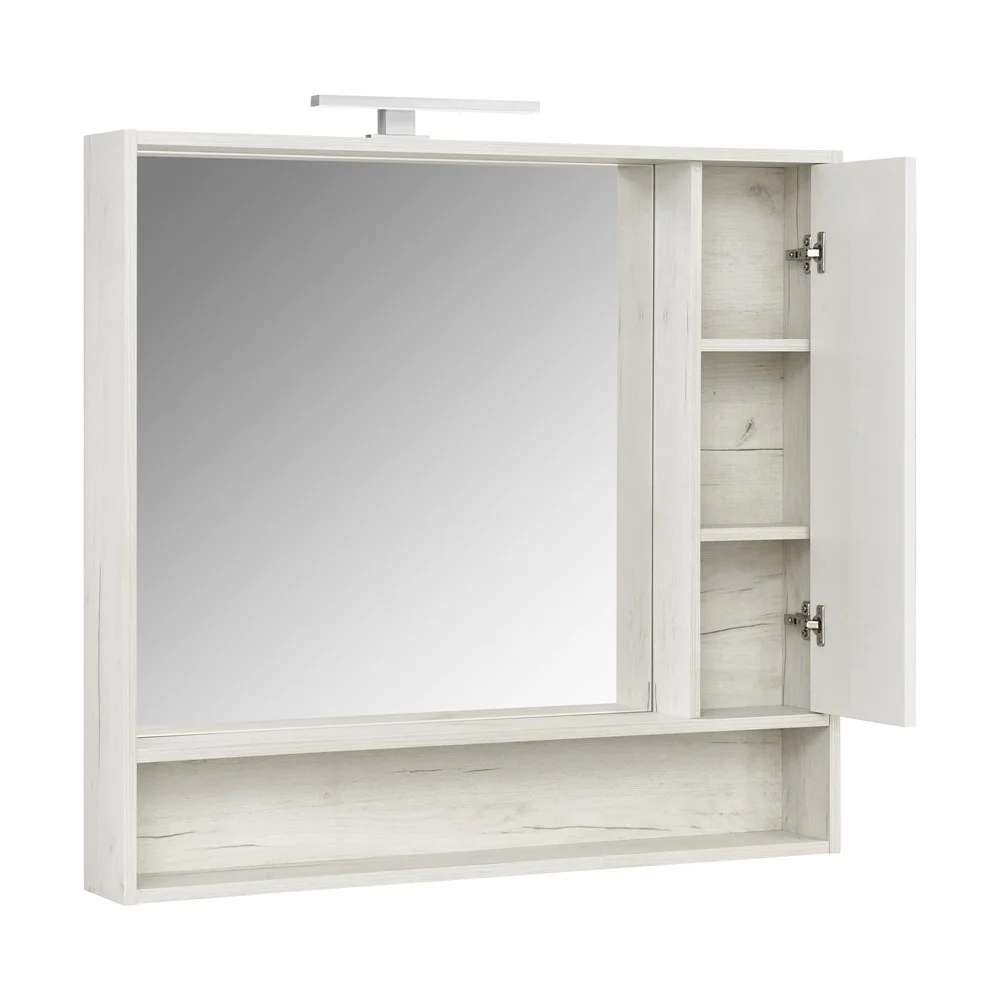 Корпус зеркального шкафа Флай 100 в современном стиле выполнен из влагостойкой ламинированной плиты в трендовом декоре дуб крафт. Фасад окрашен в белоснежный глянцевый цвет полиэфирной краской ультрафиолетового отверждения. Фасады тумбы окрашены полиэфирной краской ультрафиолетового отверждения. Такой способ окрашивания обеспечивает изделию привлекательный внешний вид, а также износостойкость и долговечность. Петли снабжены доводчиками для удобства использования. За фасадом находятся две полочки из влагостойкой ламинированной плиты. Удобная полочка под зеркалом прекрасно подойдет для размещения различных мелочей и декора для ванной комнаты.