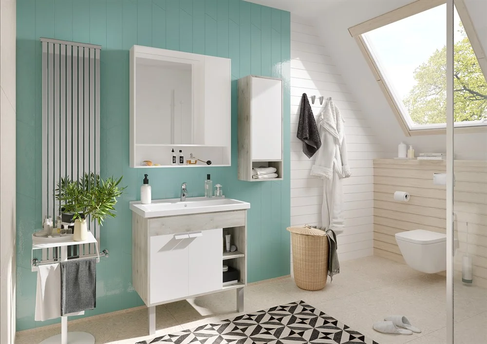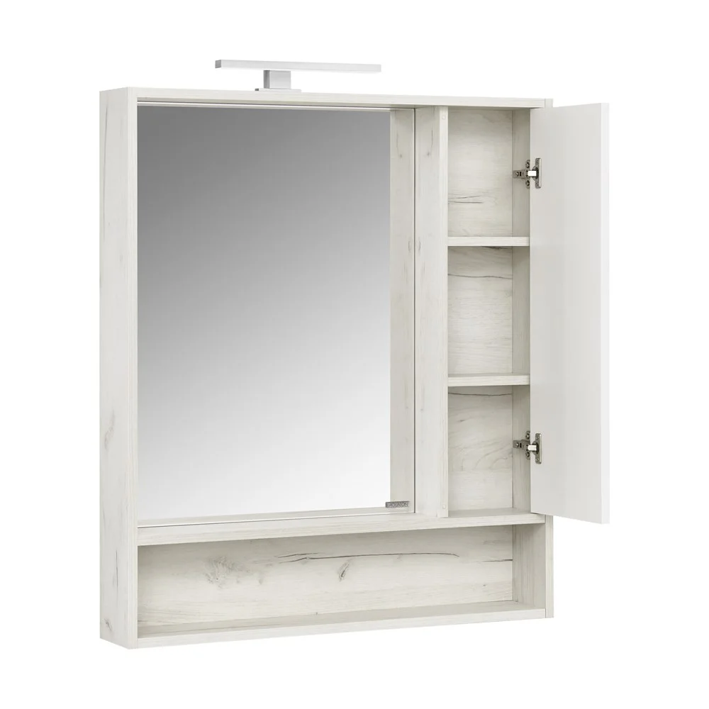 Корпус зеркального шкафа Флай 80 в современном стиле выполнен из влагостойкой ламинированной плиты в трендовом декоре дуб крафт. Фасад, расположенный справа, окрашен в белоснежный глянцевый цвет полиэфирной краской ультрафиолетового отверждения. Такой способ окрашивания обеспечивает изделию привлекательный внешний вид, а также износостойкость и долговечность. Петли снабжены доводчиками для удобства использования. За фасадом находятся две полочки из влагостойкой ламинированной плиты. Удобная полочка под зеркалом прекрасно подойдет для размещения различных мелочей и декора для ванной комнаты.