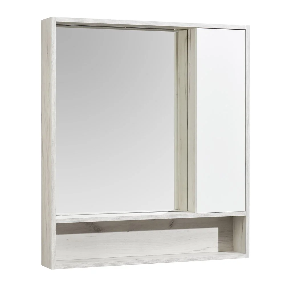 Корпус зеркального шкафа Флай 80 в современном стиле выполнен из влагостойкой ламинированной плиты в трендовом декоре дуб крафт. Фасад, расположенный справа, окрашен в белоснежный глянцевый цвет полиэфирной краской ультрафиолетового отверждения. Такой способ окрашивания обеспечивает изделию привлекательный внешний вид, а также износостойкость и долговечность. Петли снабжены доводчиками для удобства использования. За фасадом находятся две полочки из влагостойкой ламинированной плиты. Удобная полочка под зеркалом прекрасно подойдет для размещения различных мелочей и декора для ванной комнаты.