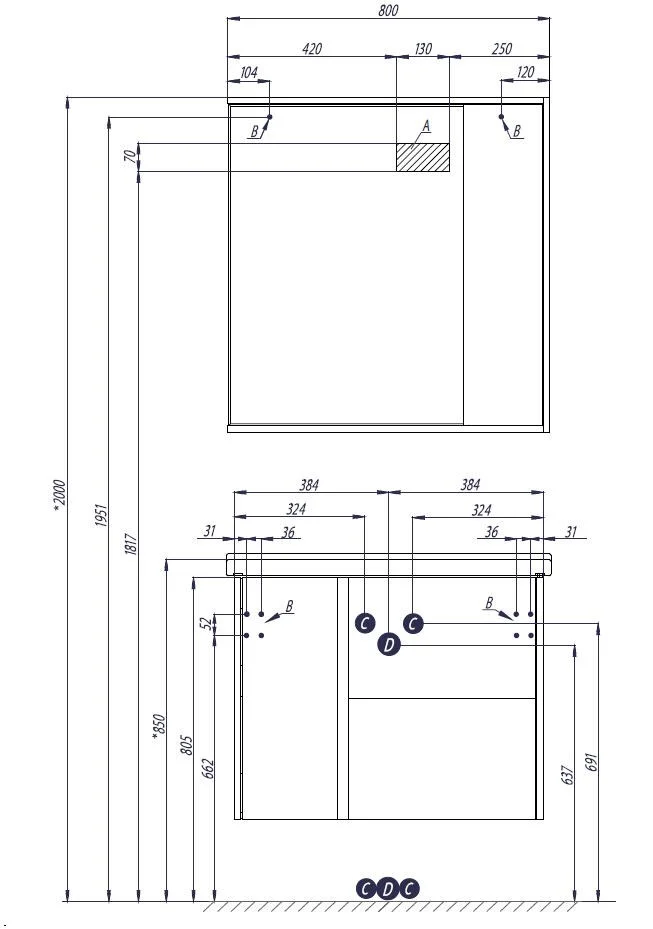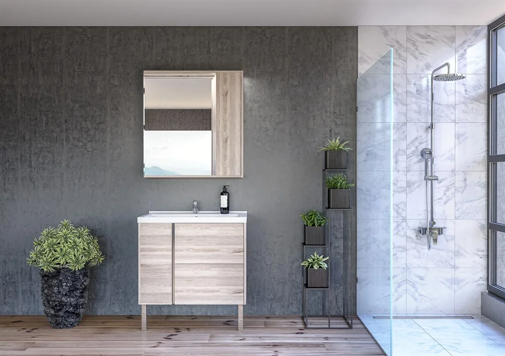 Коллекция выпускается в двух размерах 60 и 80 см и включает в себя тумбу с раковиной, зеркальный шкаф, а также шкаф-колонну.
