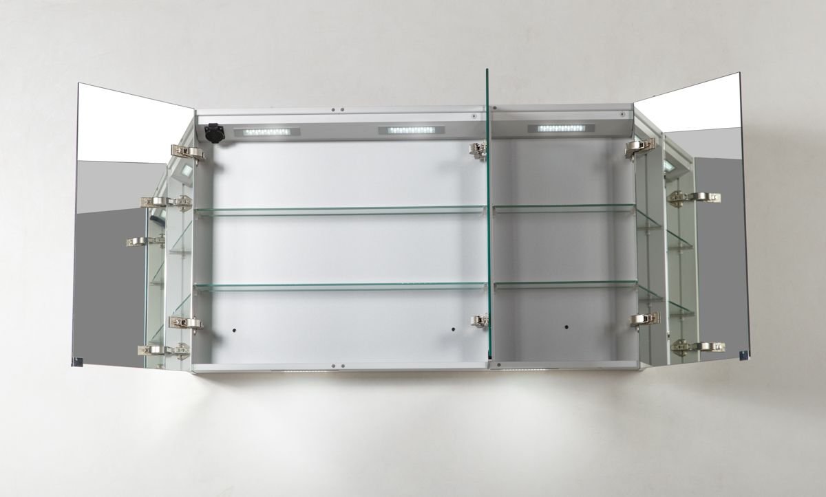 Зеркальный шкаф оснащен нижней и внутренней подсветкой,розеткой,нижним сенсорным выключателем,распашные двери оборудованы двусторонним зеркальным полотном.