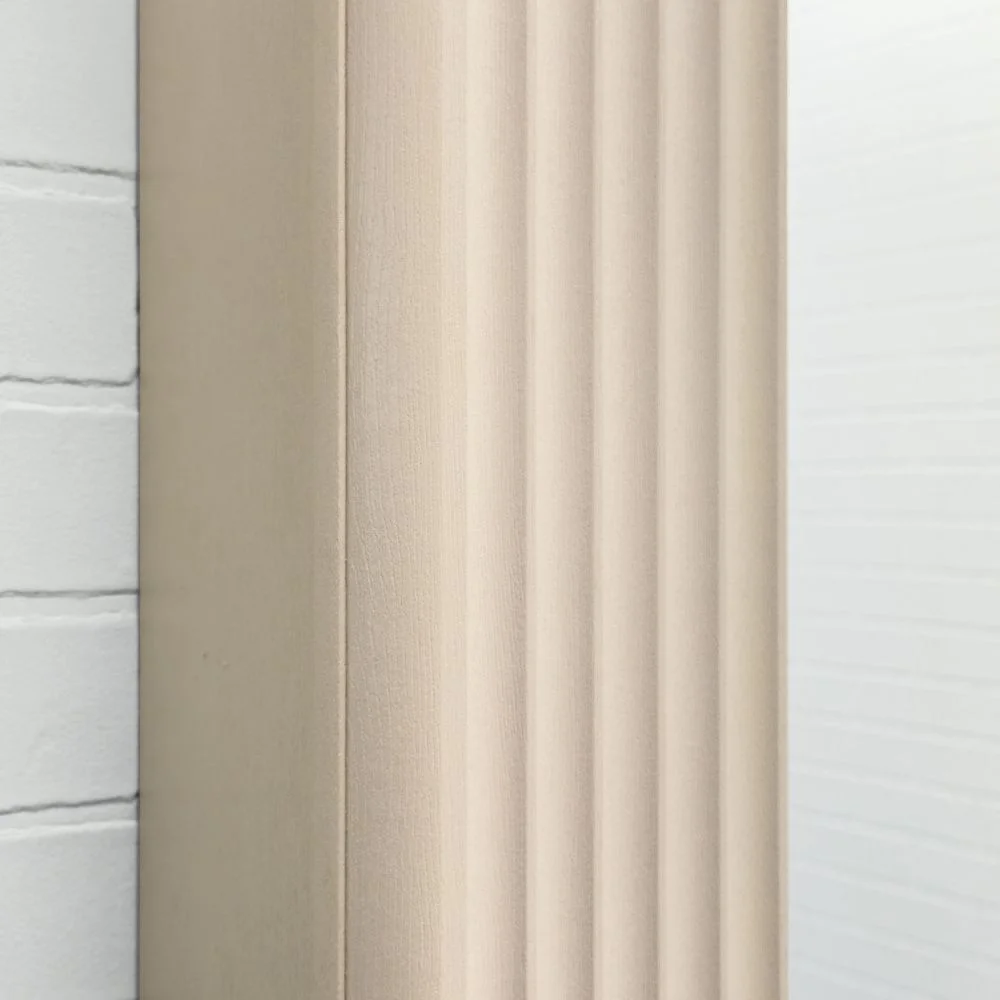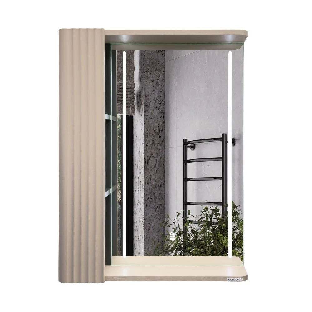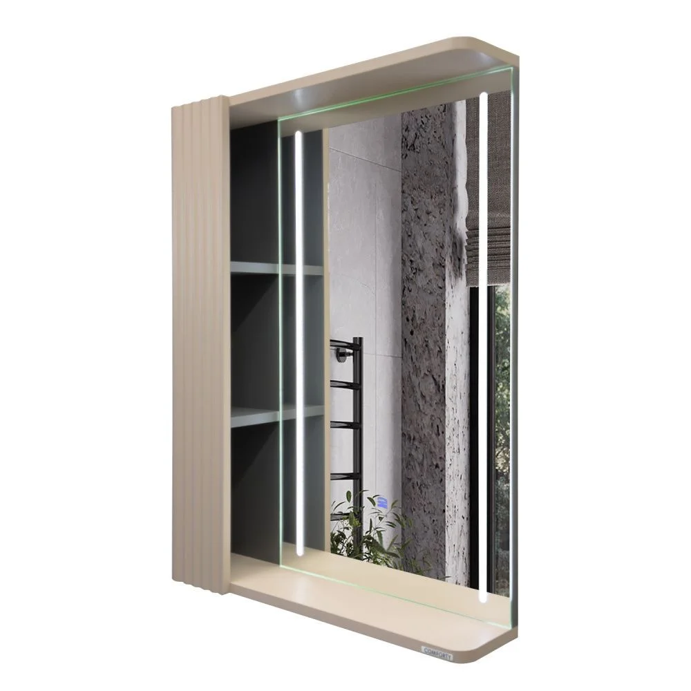 Зеркальное высококачественное полотно с амальгамой на основе серебра. Правая боковая фасадная панель декорирована вертикальной фрезеровкой. За боковой панелью две полки доступ к которым осуществляется со стороны зеркала. В модели применяется декоративная пленка с эффектом Soft-Touch с тиснением под текстуру дуба.