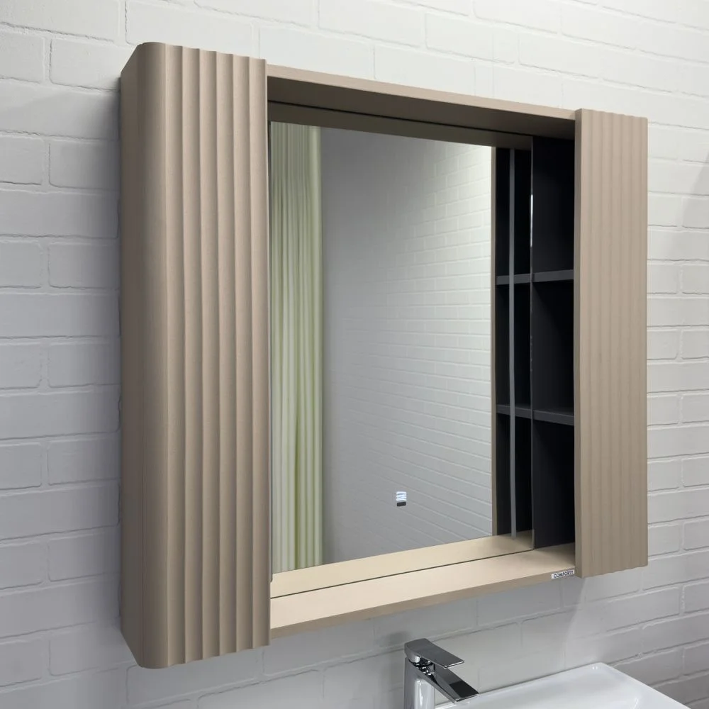 Зеркальное высококачественное полотно с амальгамой на основе серебра. Боковые фасадные панели декорированы вертикальной фрезеровкой. За каждой из боковых панелей по две полки доступ к которым осуществляется со стороны зеркала. В модели применяется декоративная пленка с эффектом Soft-Touch с тиснением под текстуру дуба.