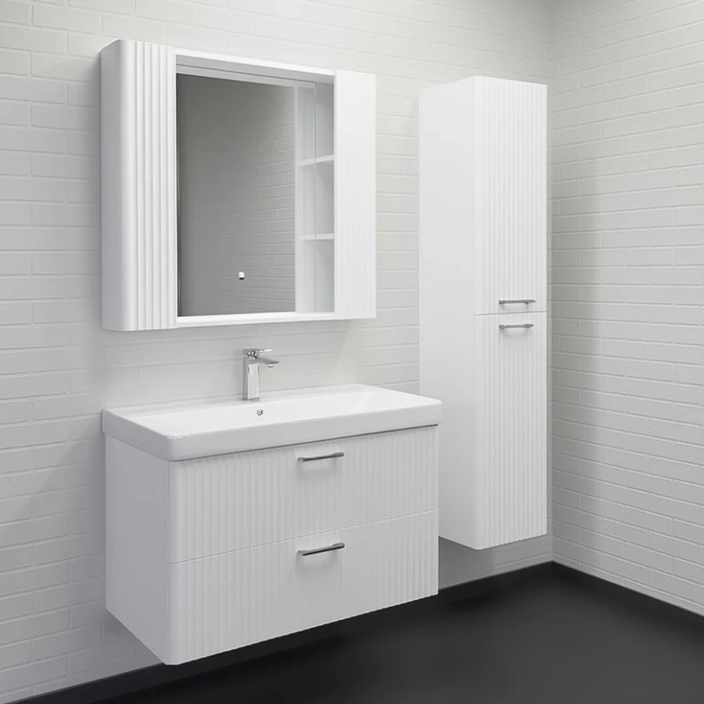 Зеркальное высококачественное полотно с амальгамой на основе серебра. Боковые фасадные панели декорированы вертикальной фрезеровкой. За каждой из боковых панелей по две полки доступ к которым осуществляется со стороны зеркала. Модель окрашена белой матовой эмалью.