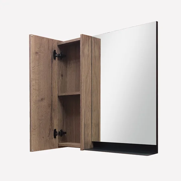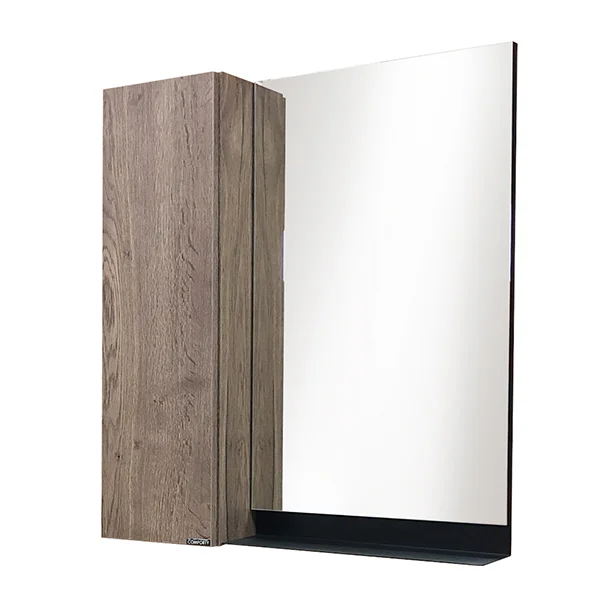 Створка оснащена петлями с механизмом плавного закрывания. Высококачественное зеркальное полотно с амальгамой на основе серебра. Фасад и корпус из влагостойкого ЛДСП Дуб темный. За створкой одна горизонтальная полка. Под зеркалом расположена металлическая полочка для размещения предметов для умывания.
