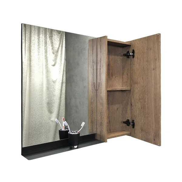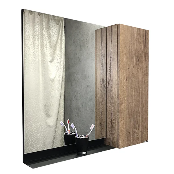Створка оснащена петлями с механизмом плавного закрывания. Высококачественное зеркальное полотно с амальгамой на основе серебра. Фасад и корпус из влагостойкого ЛДСП Дуб темный. За створкой одна горизонтальная полка. Под зеркалом расположена металлическая полочка для размещения предметов для умывания.