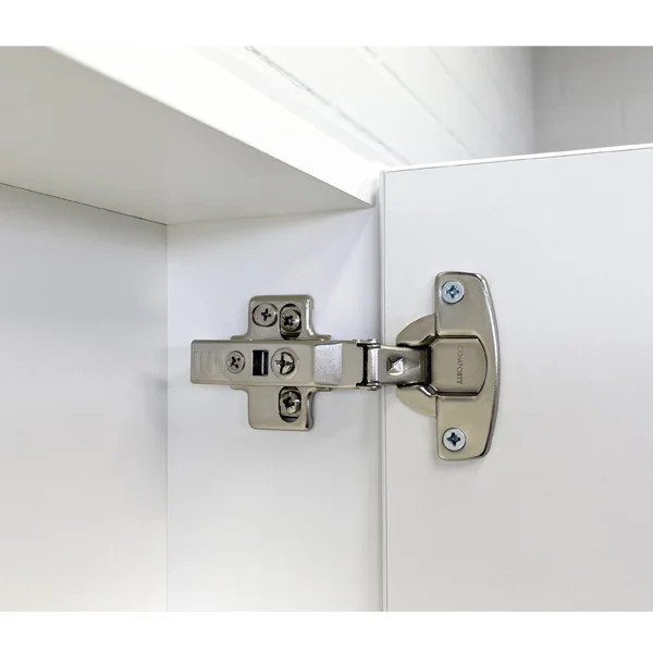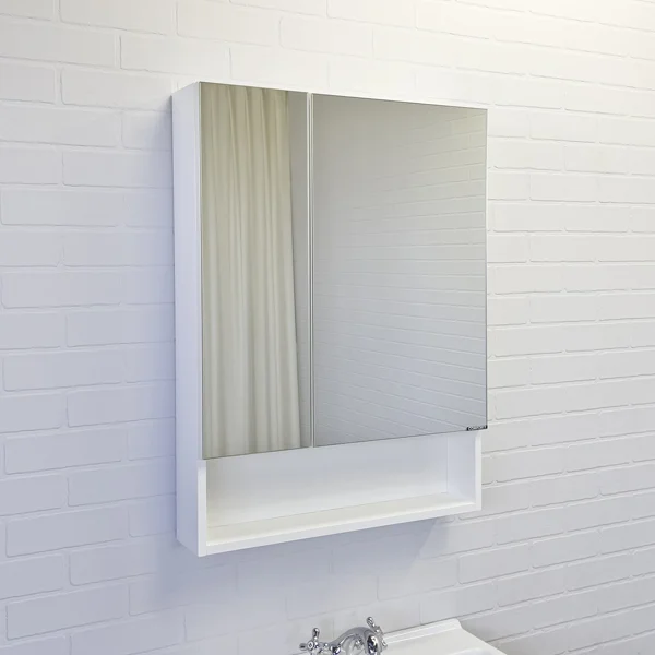 Створки оснащены петлями с плавным закрыванием. Высококачественное зеркальное полотно с амальгамой на основе серебра. Обе боковые створки зеркала открываются наружу. За широкой створкой две горизонтальные полки, за узкой одна. На нижней внешней полке можно расположить невысокие принадлежности для умывания.