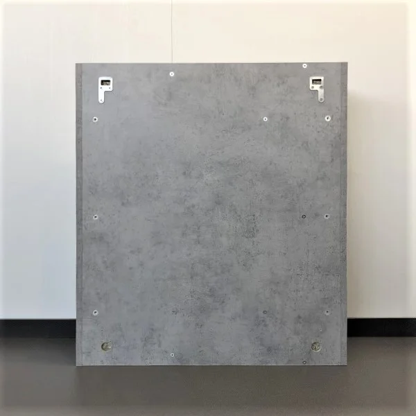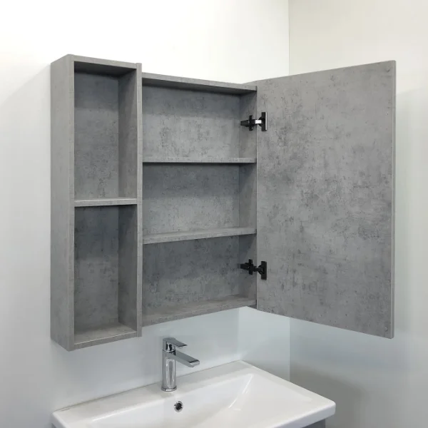 Высококачественное зеркальное полотно с амальгамой на основе серебра. Створка оснащена петлями с плавным закрыванием. Петли у створки снаружи. За зеркальной створкой две горизонтальные полки, в пространстве открытого хранения - одна.