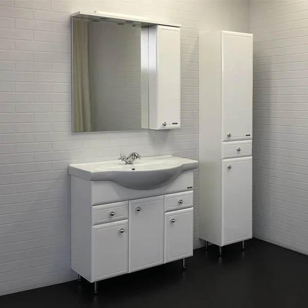 Высококачественное зеркальное полотно с амальгамой на основе серебра. Боковой шкаф окрашен белой глянцевой эмалью. Дверца шкафа оснащена петлями с плавным закрыванием. Зеркало оснащено двумя галогеновыми светильниками.