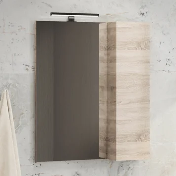 Створка оснащена петлями с плавным закрыванием. Высококачественное зеркальное полотно с амальгамой на основе серебра. Мебельный элемент из влагостойкого ДСП цвет дуб сонома. За дверцей две дополнительные полки. Зеркало-шкаф универсальное, может быть подвешено в правом и левом исполнении.
