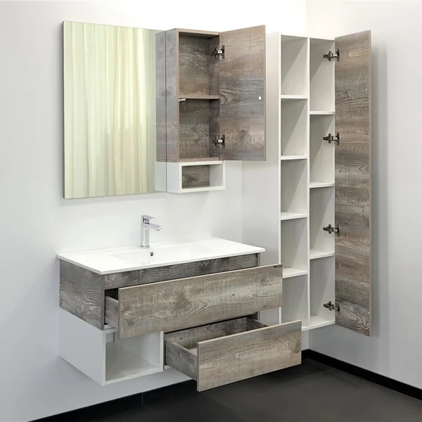 Створка оснащена системой push-to-open (открытие при нажатии). Высококачественное зеркальное полотно с амальгамой на основе серебра. Дополнительно оснащается светильником. Фасад и корпус из влагостойкого ЛДСП Дуб бежевый. За створкой одна горизонтальная полка.