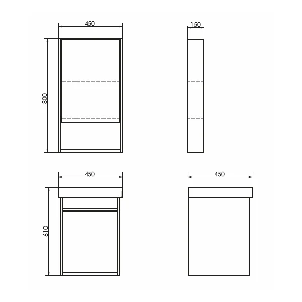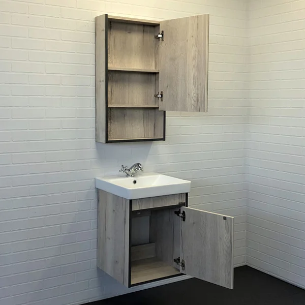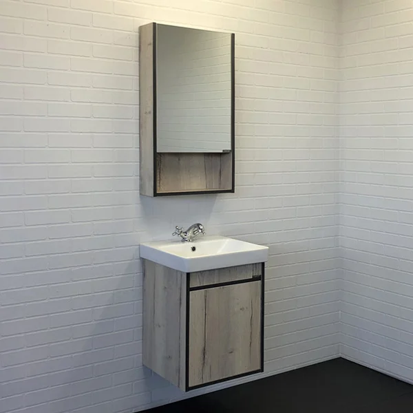 Зеркало-шкаф. Створка оснащена петлями с плавным закрыванием. За створкой одна горизонтальная полка. Высококачественное зеркальное полотно с амальгамой на основе серебра. Конструкция шкафа позволяет смонтировать зеркальную створку для открывания как вправо, так и влево.