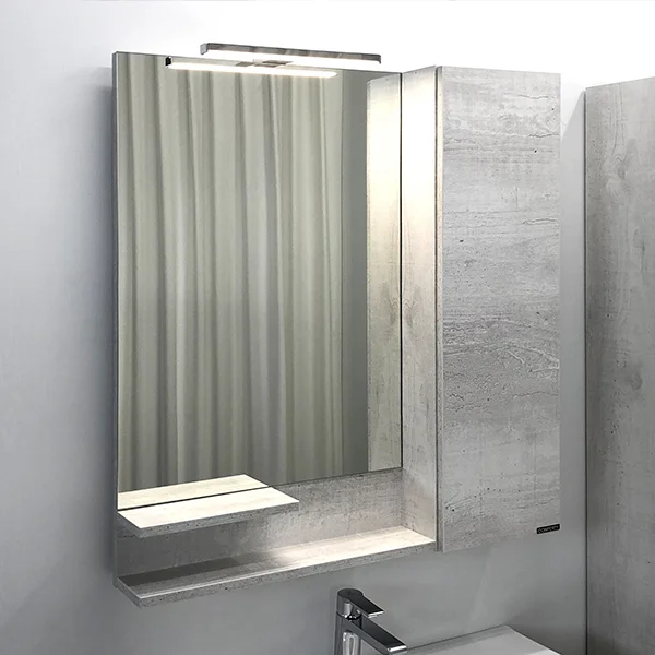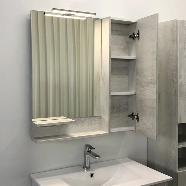 Створка мебельного элемента изготовленного из влагостойкого ДСП оснащена петлями с плавным закрыванием. За створкой две горизонтальные полки. Высококачественное зеркальное полотно с амальгамой на основе серебра. Удобные полочки для размещения принадлежностей для умывания. Дополнительно можно укомплектовать светильником.