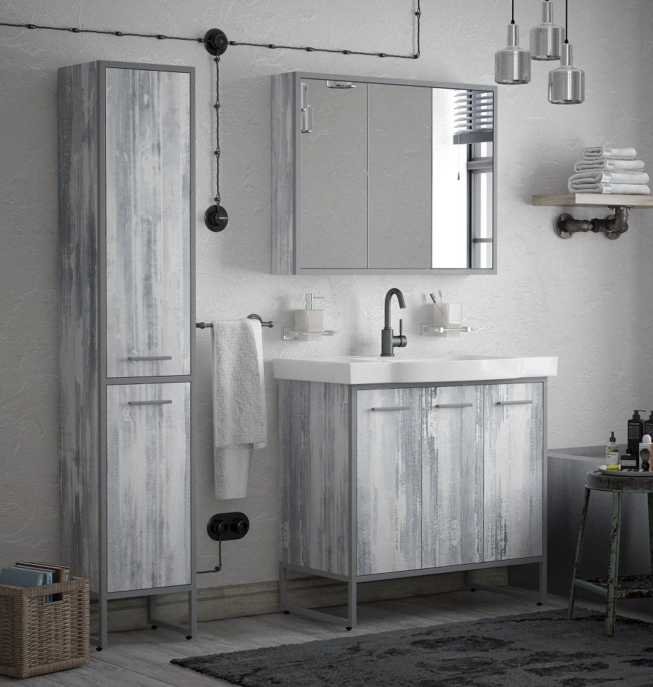 Коллекция выполнена в актуальном стиле "Лофт". Зеркало-шкаф закреплено на металлическом каркасе. У зеркало-шкафа 3 двери, в которых используются специальные толкатели, чтобы мягко открывать закрывать их. Позади дверей - полки.
