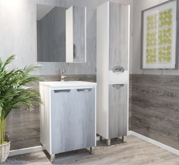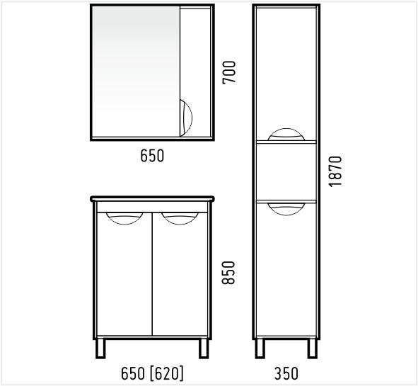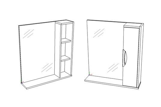 Слева расположено зеркало, справа закрытая дверца с 2-мя вкладными полками. Снизу полка в белой эмали. Белой эмалью покрашены все видимые торцы деталей.