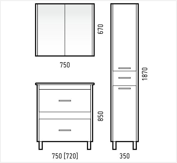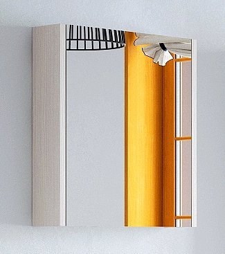 У зеркала-шкафа 2 двери с зеркалами на 500 мм и 192 мм. Боковины из ЛСДП 26 мм толщиной. У дверей есть свисы сверху и снизу - с помощью них она открывается. Позади дверей - вкладные полки. Зеркало-шкаф является универсальным, то есть при переворачивании его можно повесить большой дверью справа или слева.