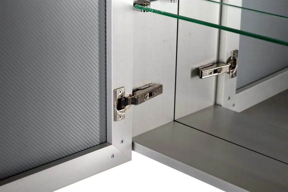 Для изготовления алюминиевых шкафов используется дорогой высококачественный анодированный алюминиевый профиль. Это означает – что такой корпус не царапается, не темнеет не подвержен коррозии, не окисляется. Зеркала изготавливаются из Японского зеркального полотна. Оригинальные светильники дополняют дизайн зеркальных шкафов. Полкодержатели прочно удерживают стеклянные полки. В наших алюминиевых шкафах зеркала не только на фасаде, но и внутри. Фурнитура BLUM.