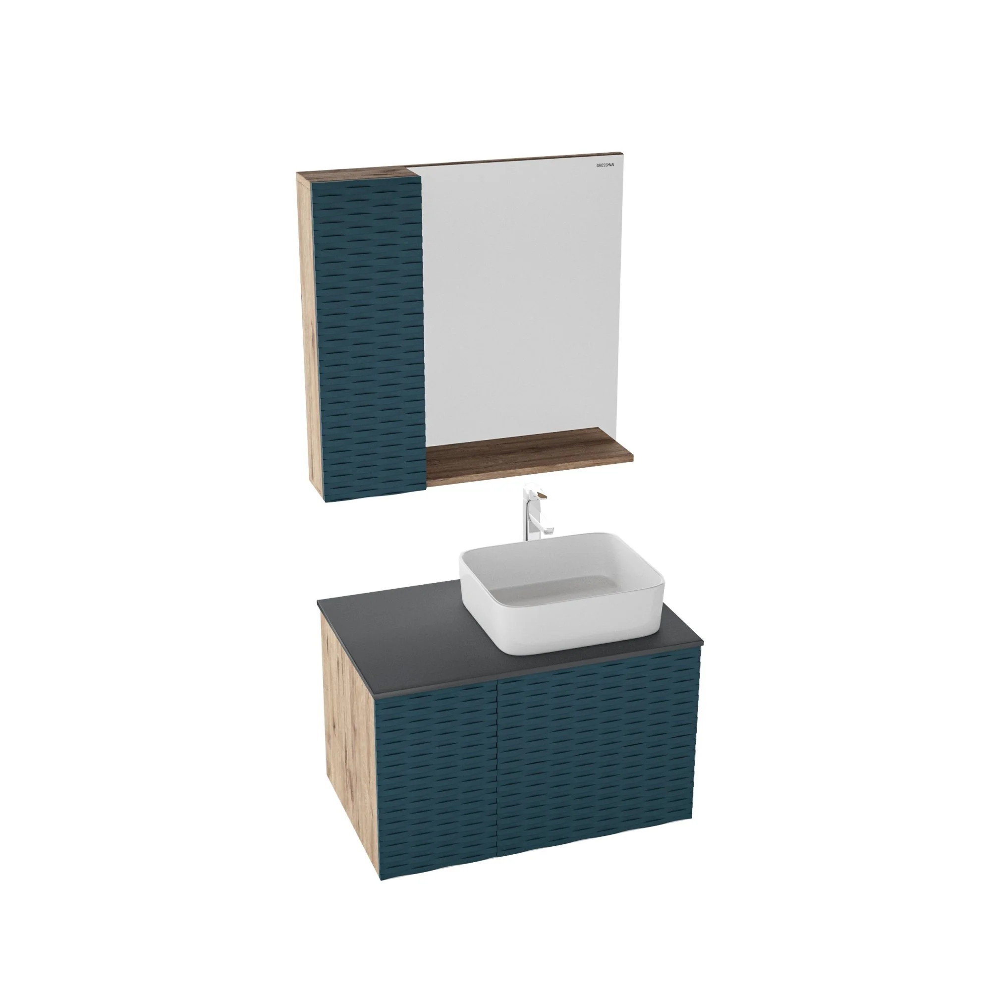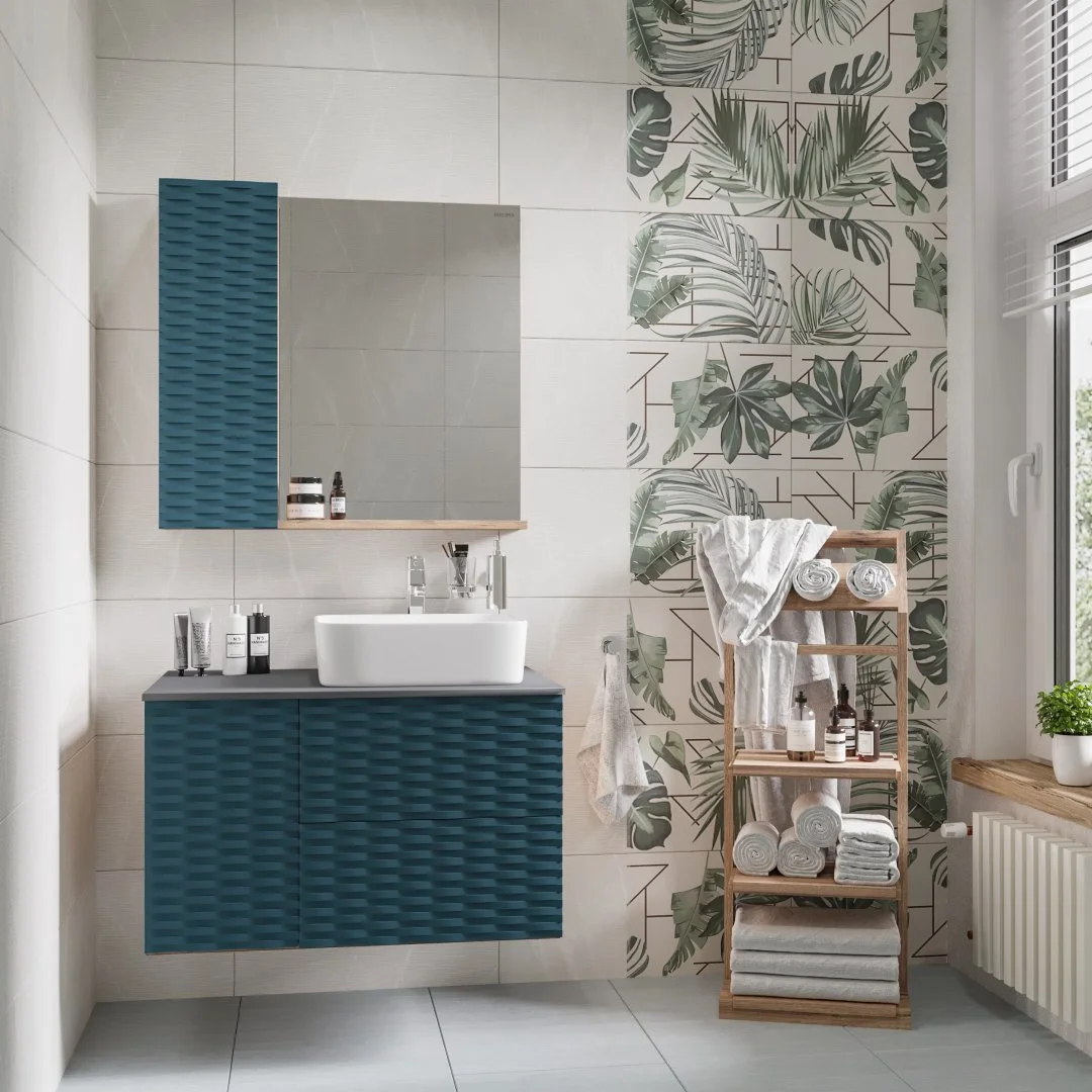 Шкаф-зеркало Альба 80 см отражает современные тенденции в дизайне мебели для ванных комнат: матовая пленка в цвете Бриз с 3D рисунком безупречно сочетается с текстурой под дерево , отсутствие лишних деталей.