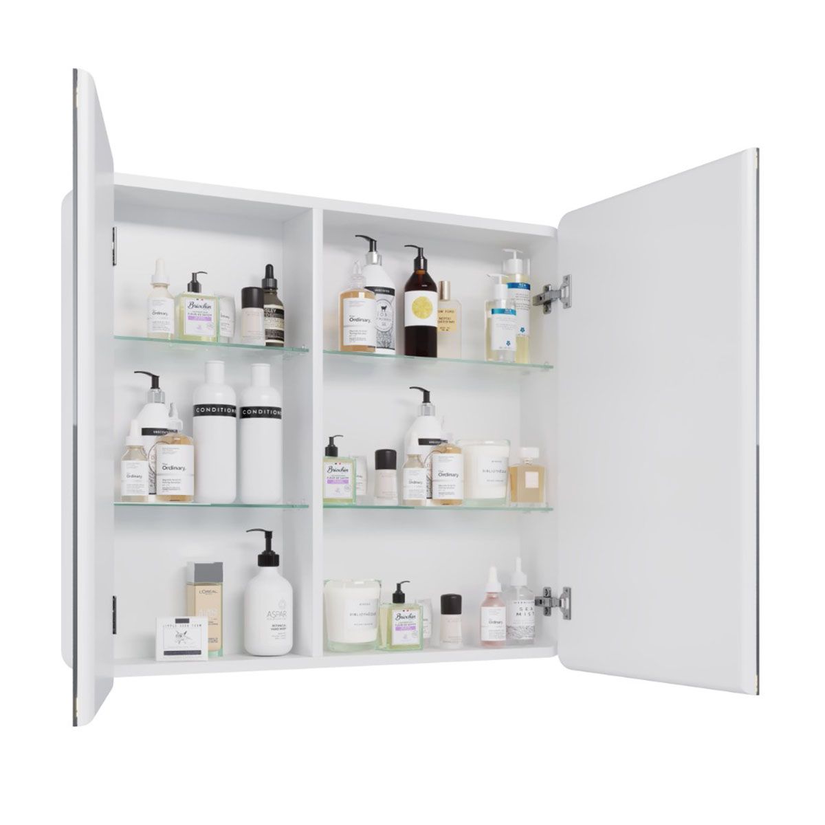 зеркало, внешняя подсветка, розетка, сенсорный выключатель, стеклянные полки, подвесы
