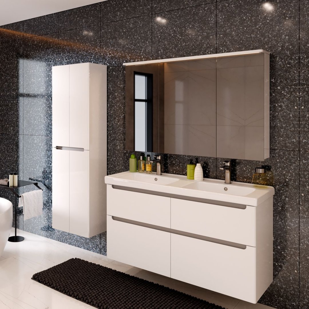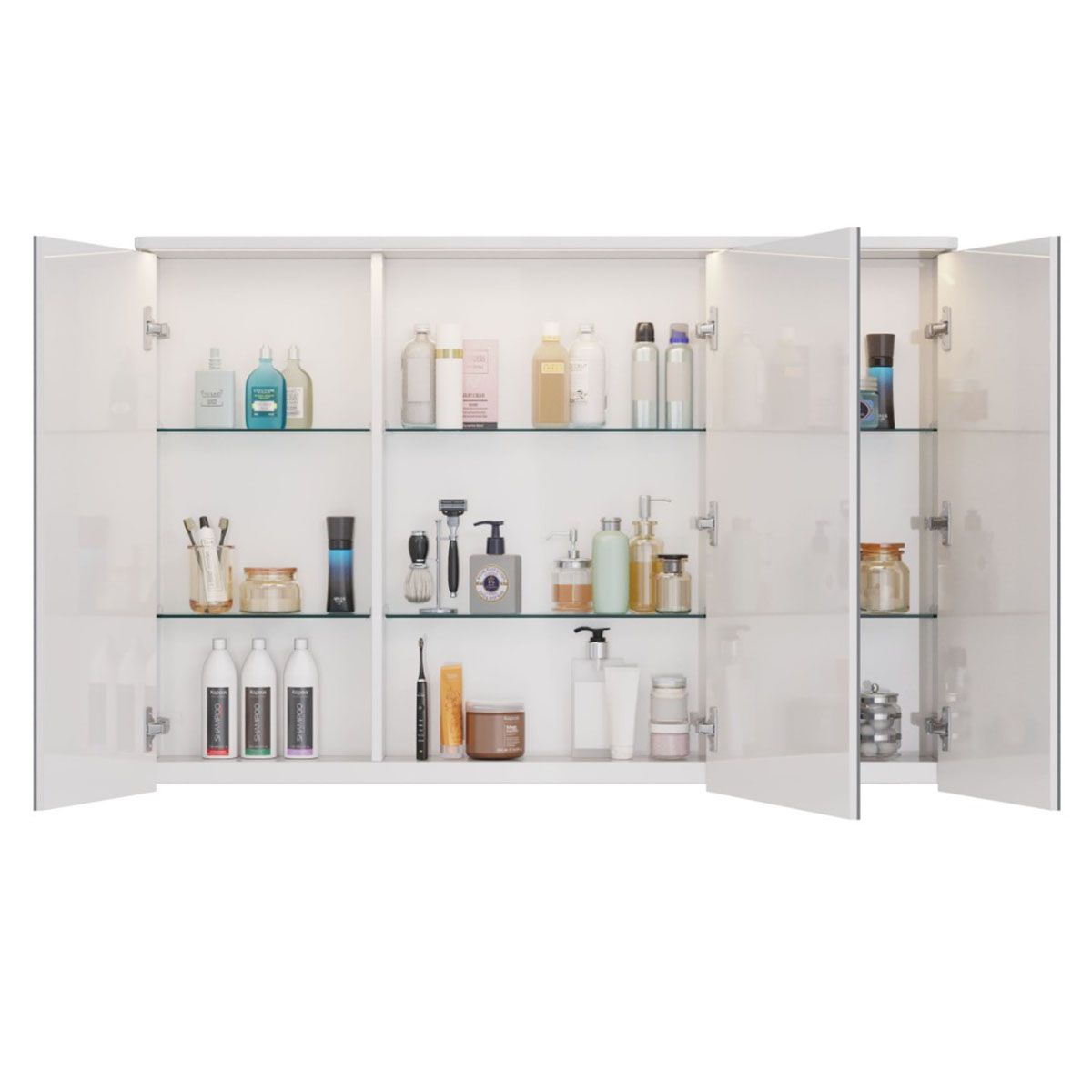 зеркало, внешняя подсветка, розетка, выключатель, стеклянные полки, подвесы