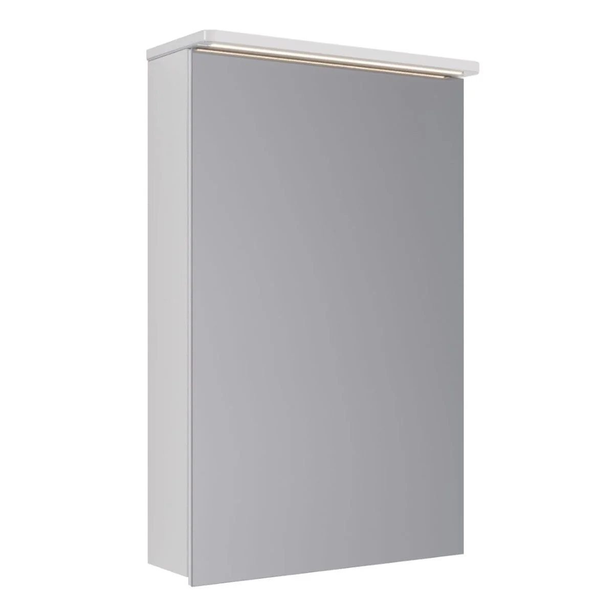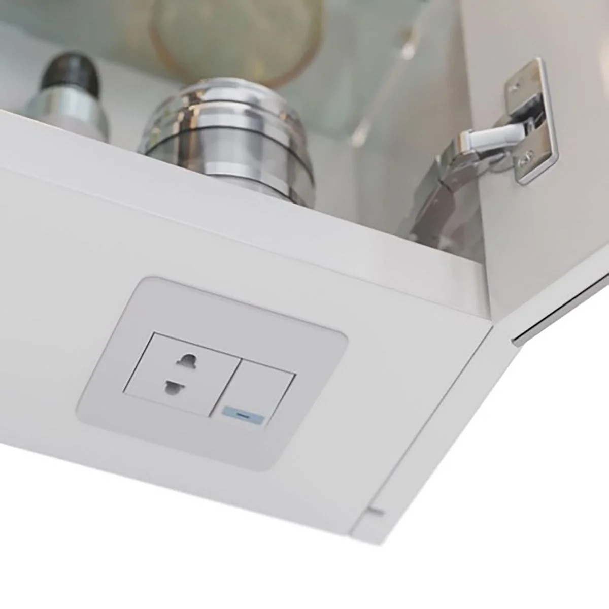 зеркало, внешняя подсветка, розетка, выключатель, стеклянные полки, подвесы