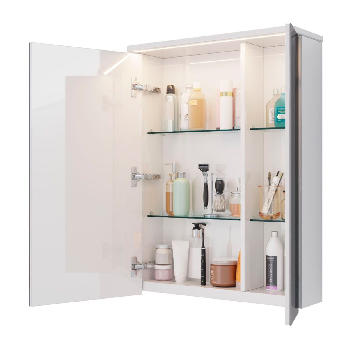 зеркало, внешняя подсветка, розетка, выключатель, стеклянные полки, подвесы