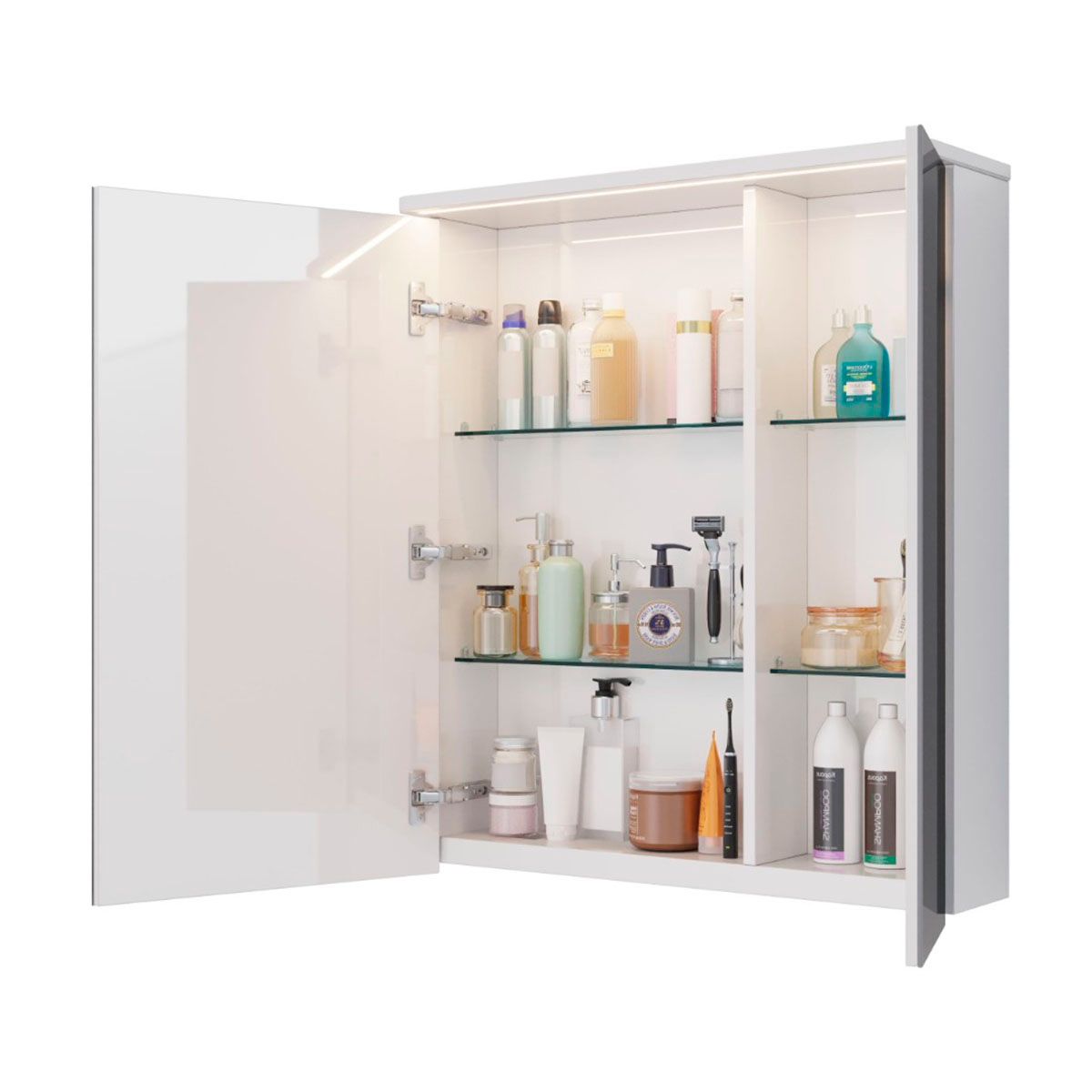 зеркало, внешняя подсветка, розетка, выключатель, стеклянные полки, подвесы