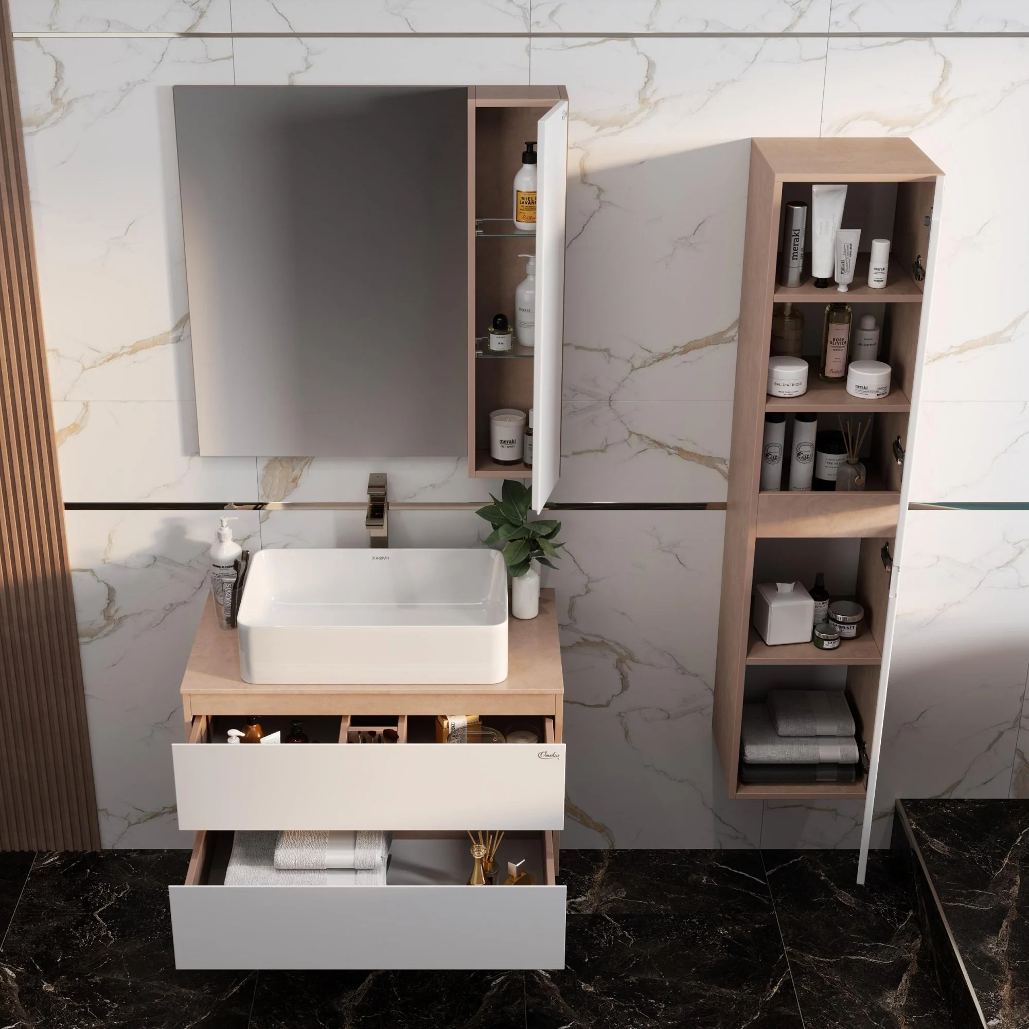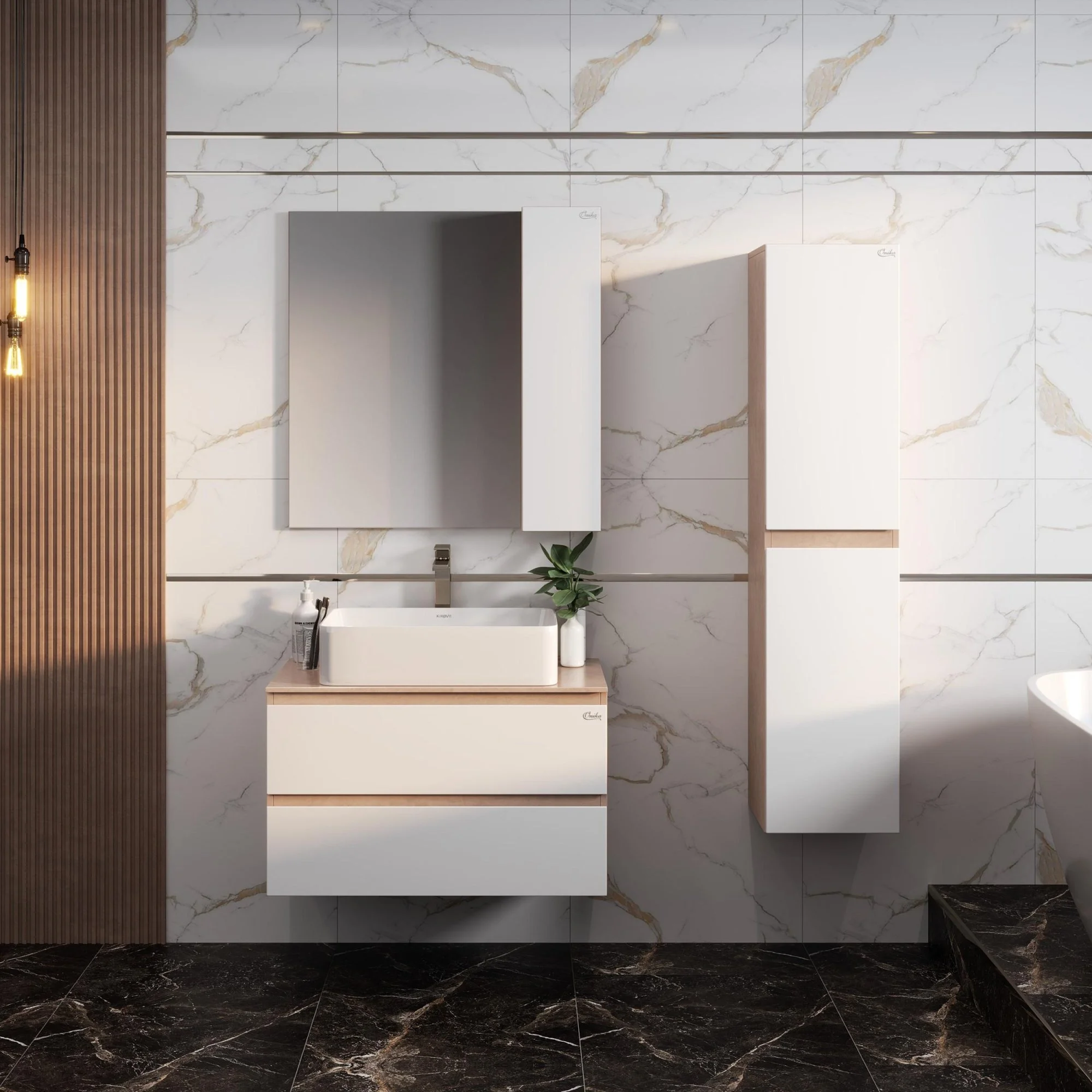 Навесной зеркальный шкаф в ванную комнату Onika АЛЕСТА 80 отражает актуальные тенденции в дизайне мебели для ванной комнаты: минимализм и геометрия фасадов, белый глянец и текстура бетонного камня, отсутствие декора.