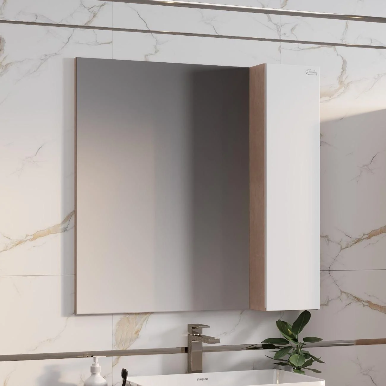 Корпус зеркального шкафа выполнен из ЛДСП, фасад - из ЛМДФ, покрытой эмалью, устойчивых к механическим воздействиям, перепадам температур и высокой влажности.