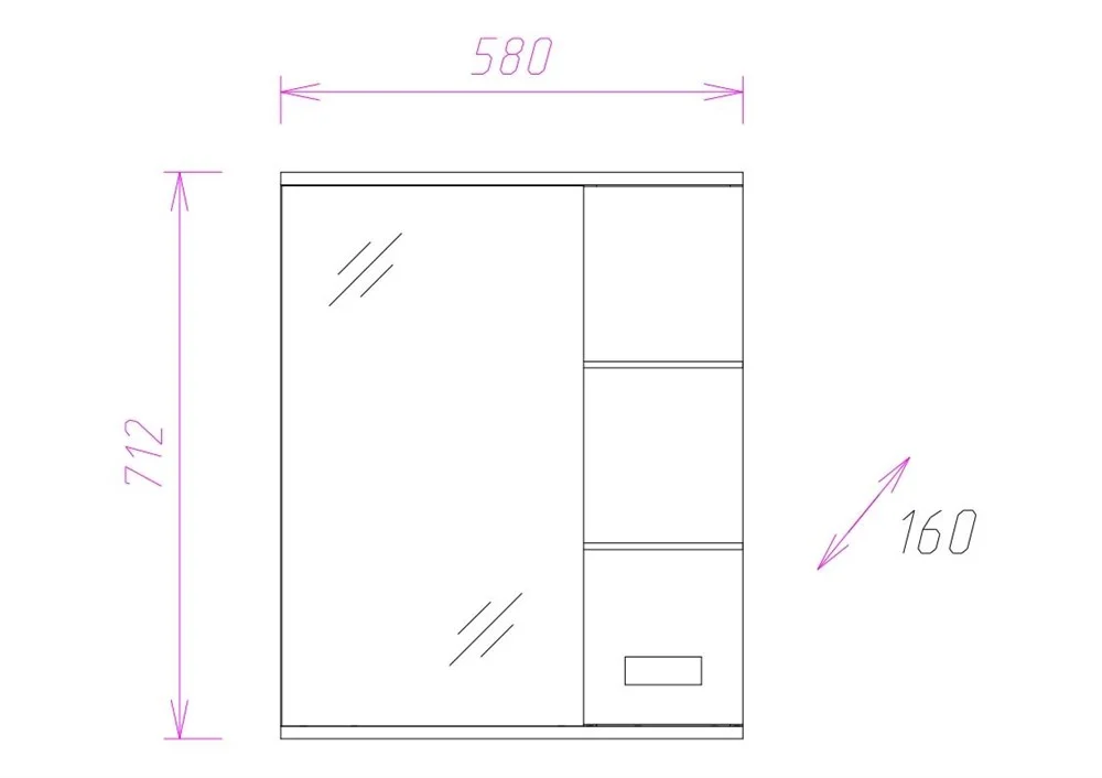 Справа от зеркала за распашной дверцей с механизмом плавного закрывания расположено отделение для хранения, разделенное на две части горизонтальной полочкой, под зеркалом - открытая полочка для косметических средств или декоративных элементов.
