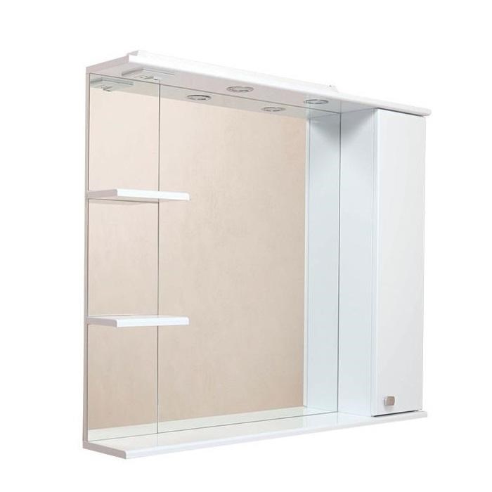 Современный функционал шкафа позволяет удобно расположить все необходимое: справа от зеркала за распашной дверцей с механизмом плавного закрывания расположено отделение для хранения, разделенное на три части горизонтальными полочками, слева и внизу под зеркалом - открытые полочки для косметических средств или декоративных элементов.