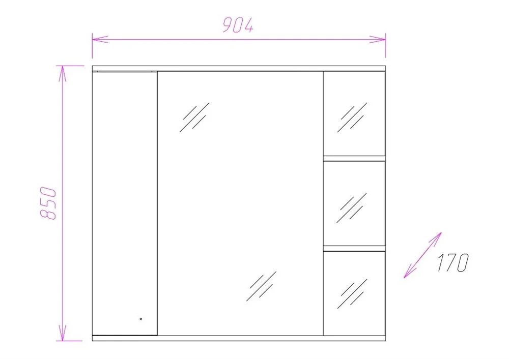 Современный функционал шкафа позволяет удобно расположить все необходимое: справа от зеркала за распашной дверцей с механизмом плавного закрывания расположено отделение для хранения, разделенное на три части горизонтальными полочками, слева и внизу под зеркалом - открытые полочки для косметических средств или декоративных элементов.