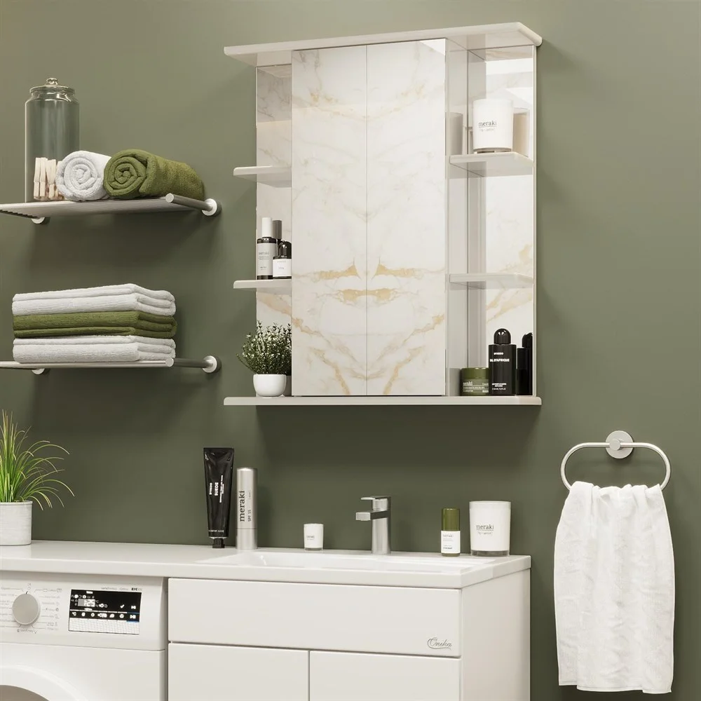 В центре шкафа - зеркальная дверца с механизмом плавного закрывания, за которой скрывается отделение для хранения, разделенное на две части горизонтальной полочкой. По бокам - открытые полочки для косметических средств или декоративных элементов.