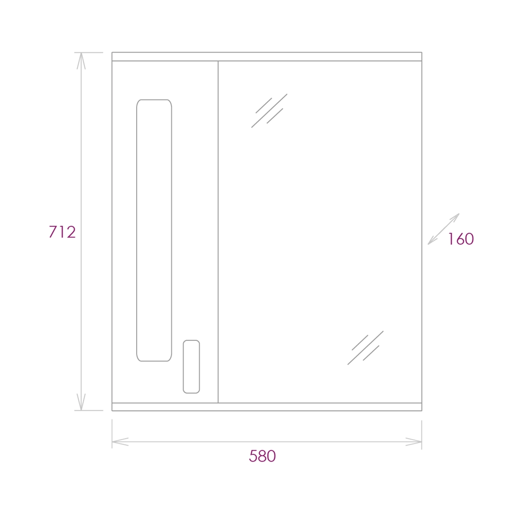 Слева от зеркала за распашной дверцей с механизмом плавного закрывания расположено отделение для хранения, разделенное двумя горизонтальными полочками, под зеркалом - открытая полочка для косметических средств или декоративных элементов.