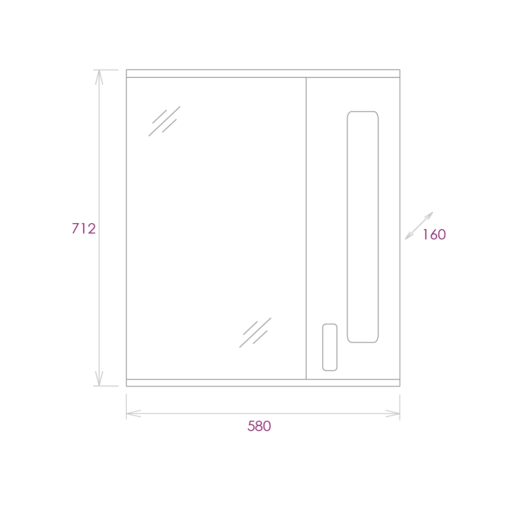 Справа от зеркала за распашной дверцей с механизмом плавного закрывания расположено отделение для хранения, разделенное двумя горизонтальными полочками, под зеркалом - открытая полочка для косметических средств или декоративных элементов.