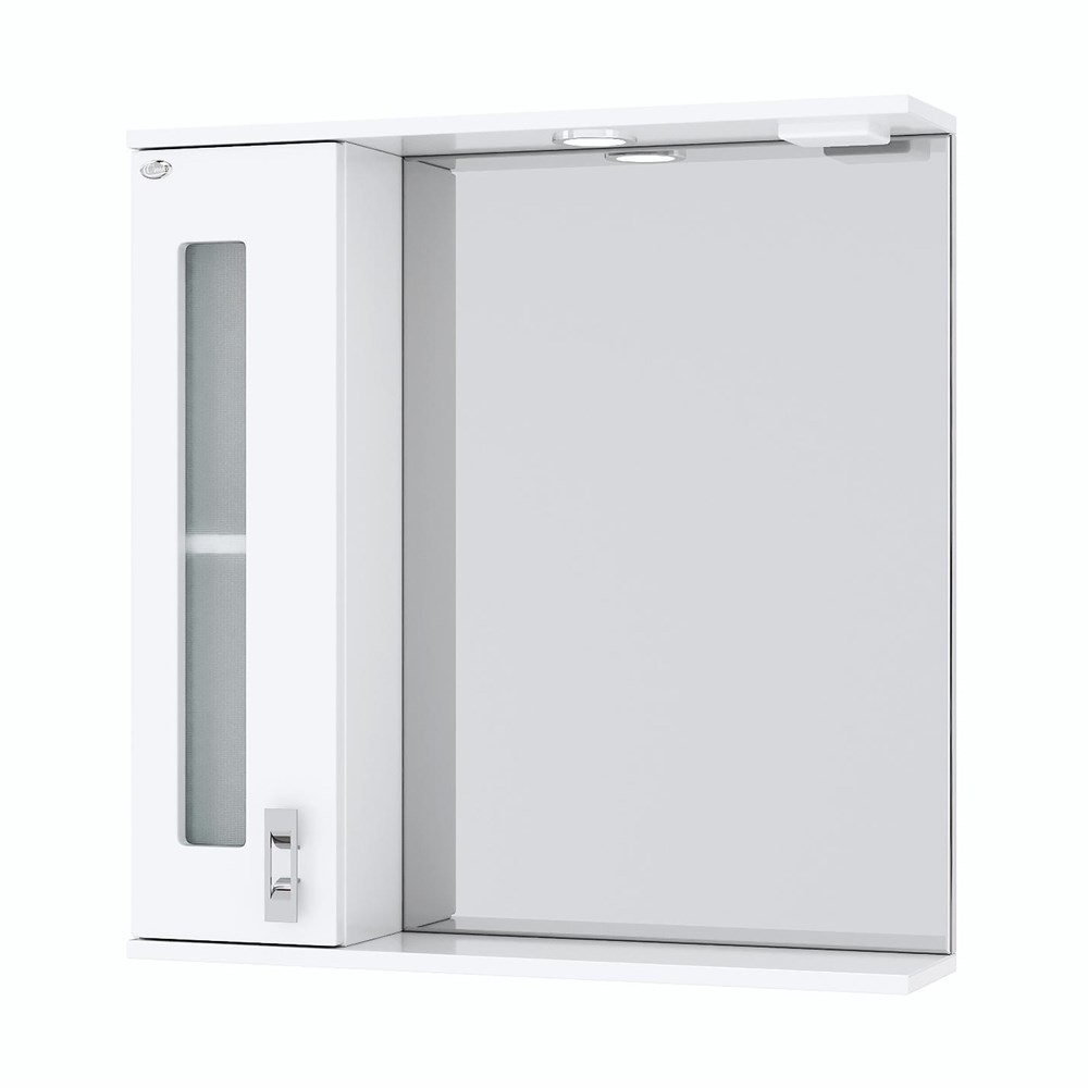 Слева от зеркала за распашной дверцей с механизмом плавного закрывания расположено отделение для хранения, разделенное двумя горизонтальными полочками, под зеркалом - открытая полочка для косметических средств или декоративных элементов.