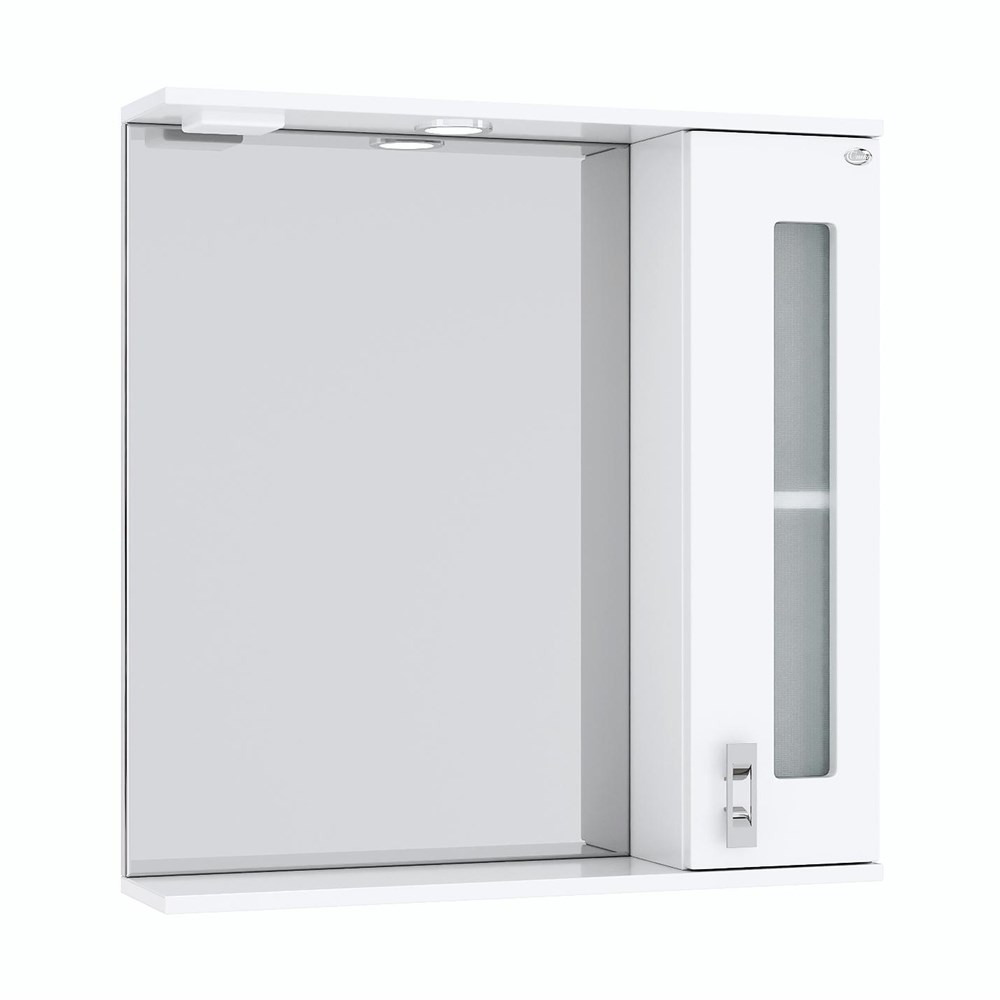 Справа от зеркала за распашной дверцей с механизмом плавного закрывания расположено отделение для хранения, разделенное двумя горизонтальными полочками, под зеркалом - открытая полочка для косметических средств или декоративных элементов.