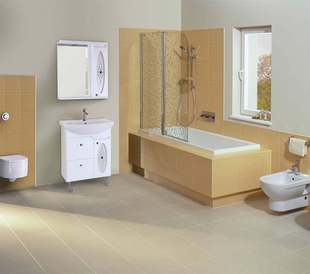 Белоснежный цвет фасада в сочетании со вставками из матового стекла и хромированными ручками необычной формы придадут ванной комнате атмосферу уюта и благоустроенности, а большое пространство для хранения поможет удобно разместить все необходимое.